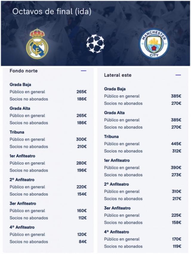 3月2日讯 皇马官方公布欧冠1/8决赛首回合对阵曼城票价,价格从84欧元到445欧元不等。北京时间3月12凌晨4点,皇马和曼城的首回合将在伯纳乌进行。近几个赛季,皇马和曼城多次在欧冠赛场上相遇。